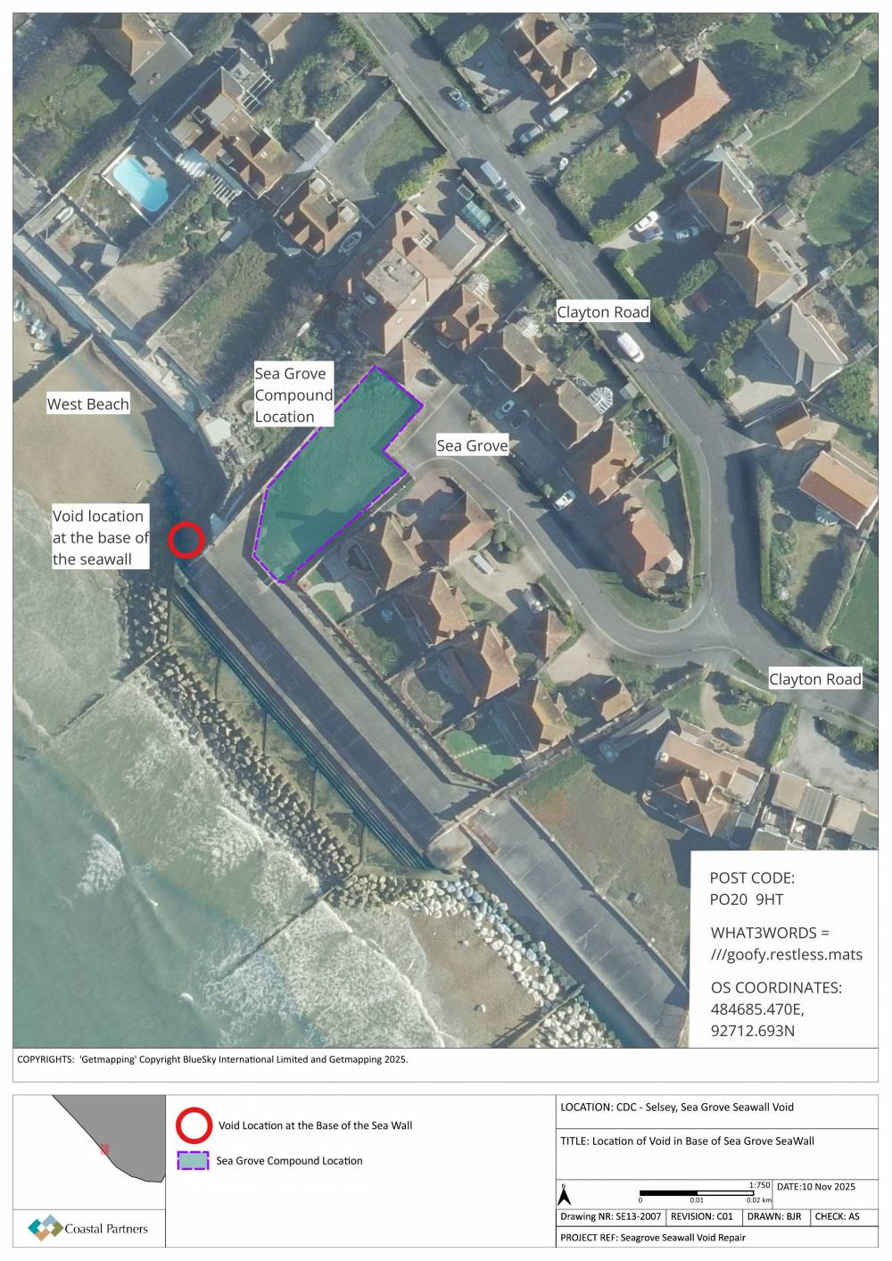 We will be setting up a small compound as shown in this map. To reduce the risk of slipping the area will first be jet washed, once this has been carried out 3 x 150mm cores will be drilled on top of the sea wall. 15 m3 of concrete will then be poured in order to fill the void and once this is complete, the cores will be re-instated and the works will be demobilised.